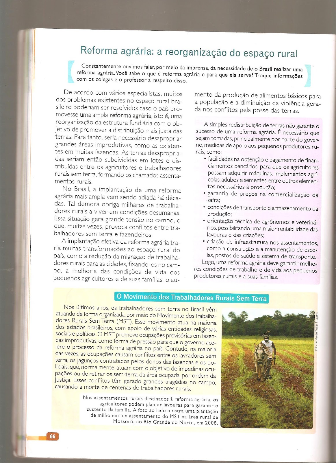 Este tipo de abordagem é a mais difícil de ser avaliada por uma pessoa sem visão de maldade, razão pela qual é a que mais passa despercebida. Não obstante, não se contentaram os responsáveis pelo conteúdo do livro didático em pauta, eis que partiram para a franca propaganda da reforma agrária e do MST, conforme veremos em trechos do Capítulo 7 – O trabalho e a terra no espaço rural brasileiro.